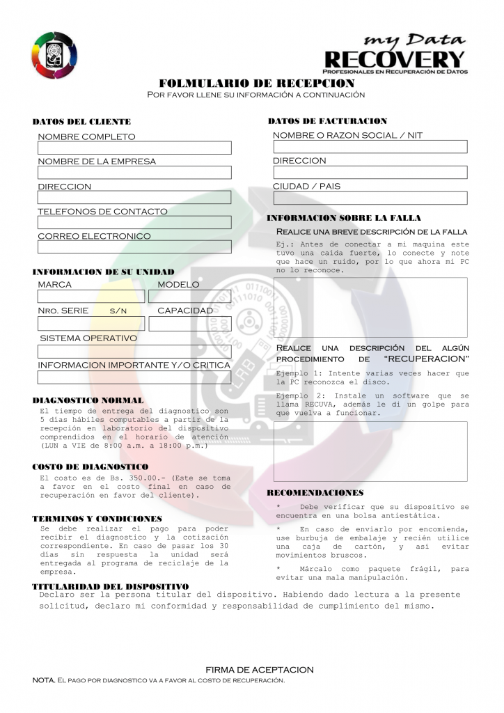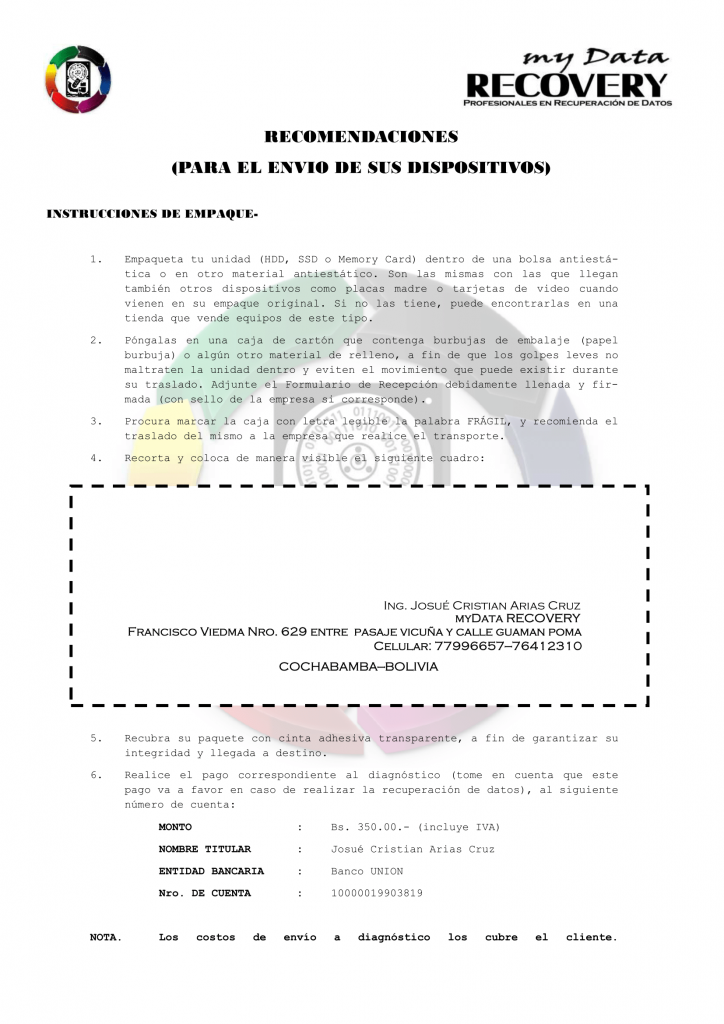 17 febrero, 2019 Arias Cruz Josué Cristian Contáctenos Formulario de recepción previa coordinación con el cliente. Si estas en el interior del País, te recomiendo el siguiente PDF para el envió de tu Dispositivo. Imprime aqui el formulario de Recepcion Imprime aquí las Recomendaciones de Envio